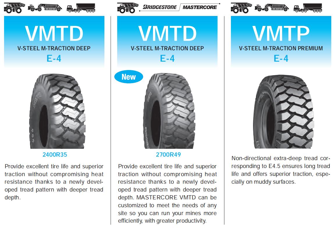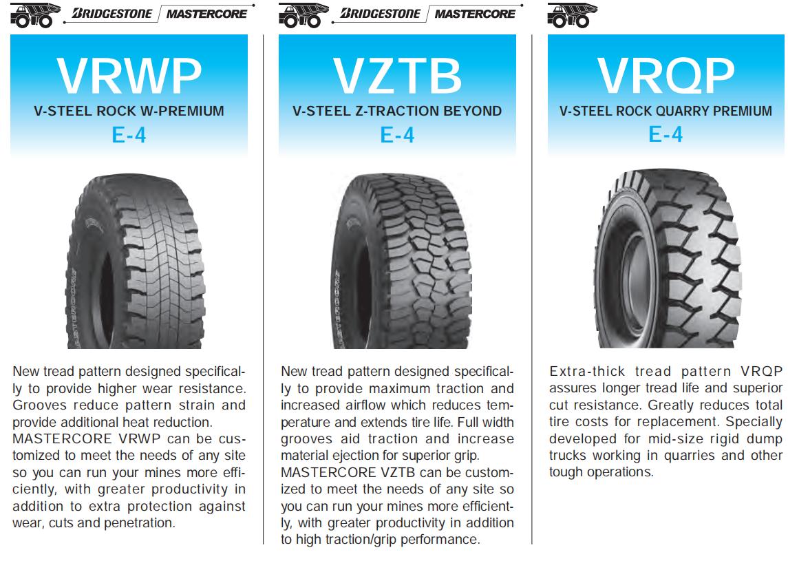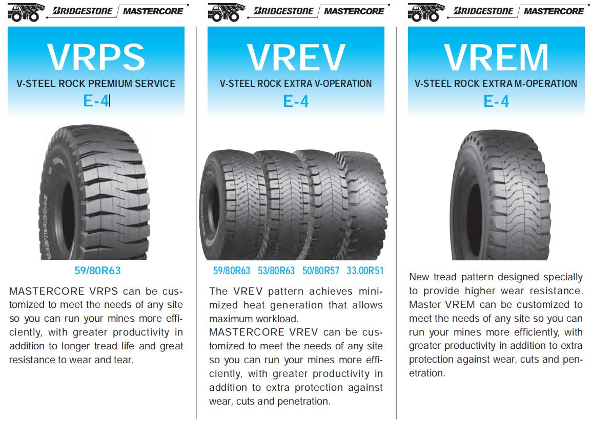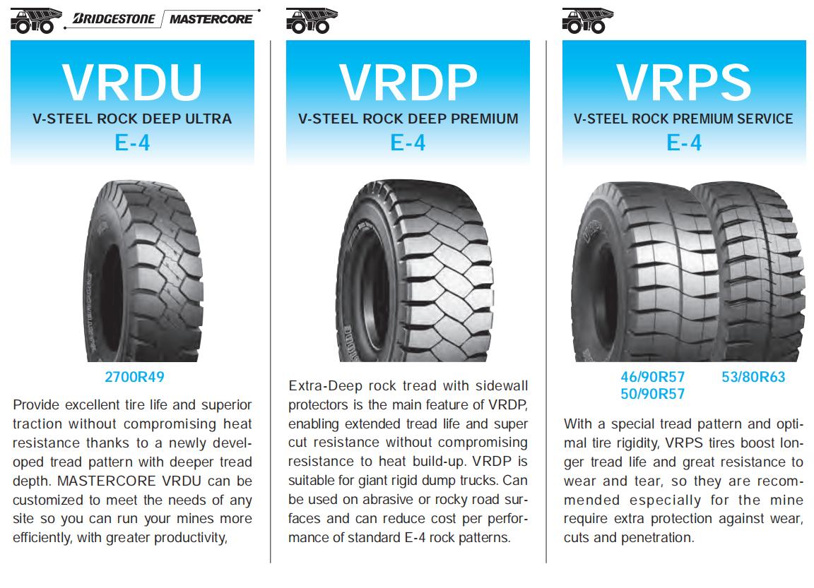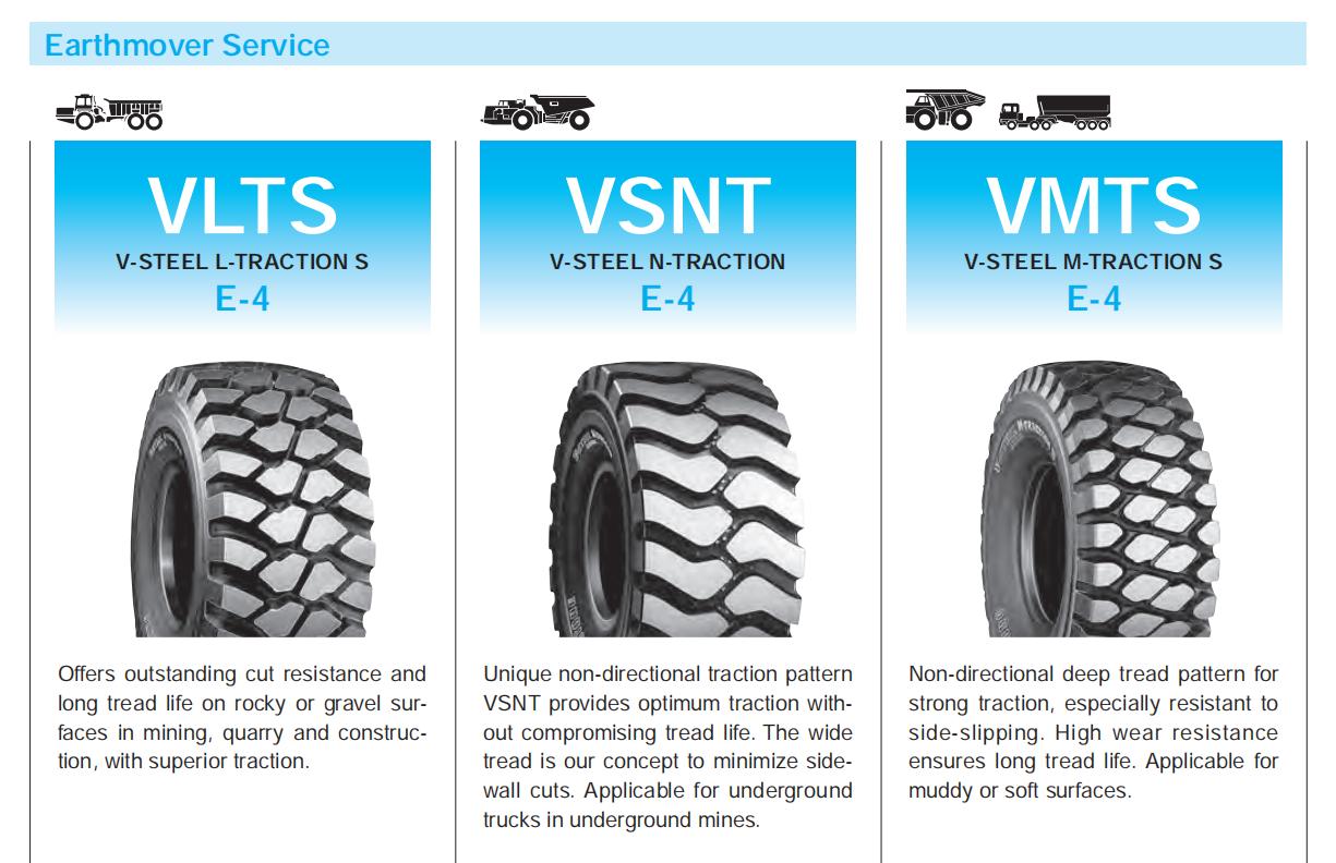 Ultra-Class Mining Haul Trucks (Highest capacity hauling for the world’s biggest mines) | 51″ Rim: 30.00R51 (VMT, VRLS), 33.00R51 (VMT, VMTP, VRLS, VRDP, VRPS, VREV), 36.00R51 (VHS, VRLS), 50/65R51 (VSDL) 57″ Rim: 37.00R57 (VZTS, VRLS), 40.00R57 (VMT, VZTS, VELS, VRDP, VRPS), 42/90R57 (VRDP, VRPS), 46/90R57 (VZTP, VRPS), 50/80R57 (VREV, VREM), 50/90R57 (VRPS), 55.5/80R57 (VSDL), 60/80R57 (VSDL) 63″ Rim: 53/80R63 (VRPS, VREV, VREM), 59/80R63 (VRF, VRPS, VREV, VREM) |