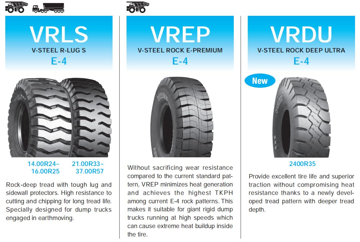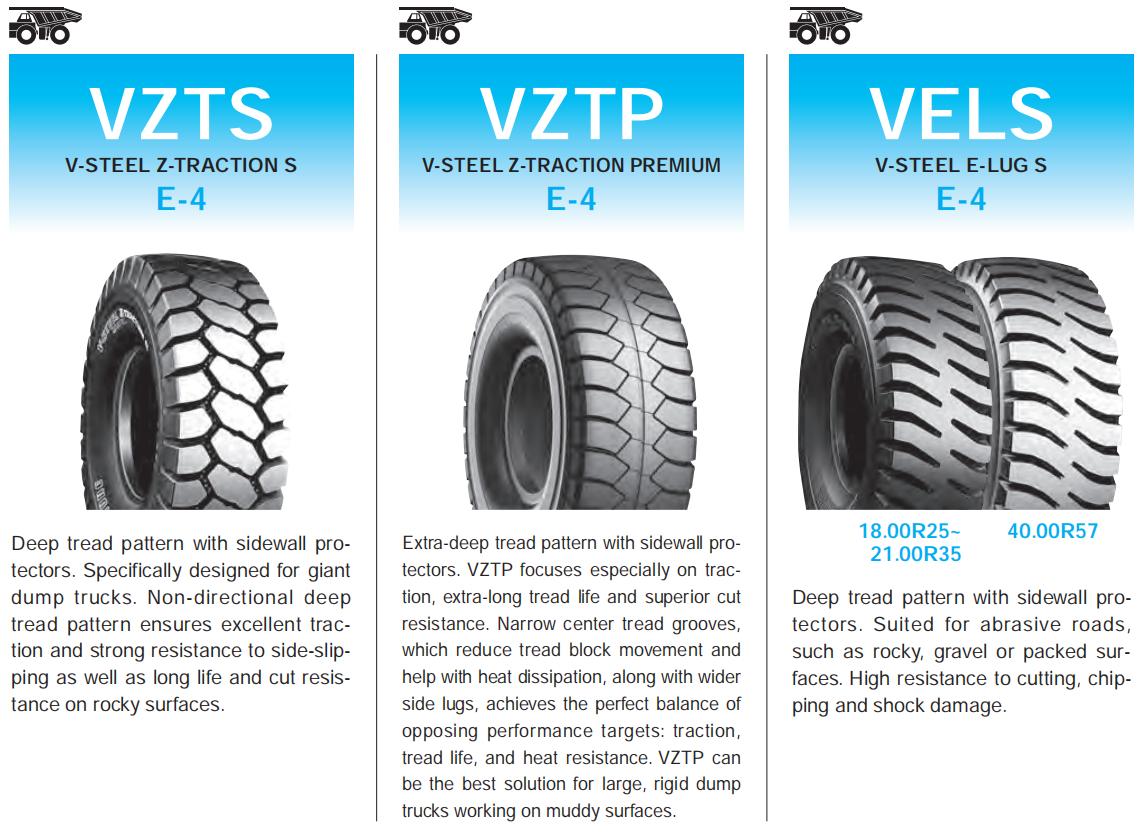 Giant-Class Mining Haul Trucks (The largest equipment in open-pit mines) | 39″ Rim: 37.5R39 (VKT), 40.5/75R39 (VLT), 45/65R39 (VSDL) 45″ Rim: 45/65R45 (VSNL, VSDL) 49″ Rim: 27.00R49 (VFT, VMTS, VMTP, VRLS, VREP, VRDP, VREV, VRDU, VMTD) |