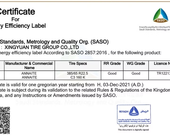 With the advancement of Saudi Arabia’s “Vision 2030,” SASO may further strengthen tire energy efficiency labeling (e.g., rolling resistance grading) and digital management (e.g., QR code traceability). Exporting enterprises need to continuously monitor regulatory updates and establish long-term compliance mechanisms to maintain their market share in the Middle East.