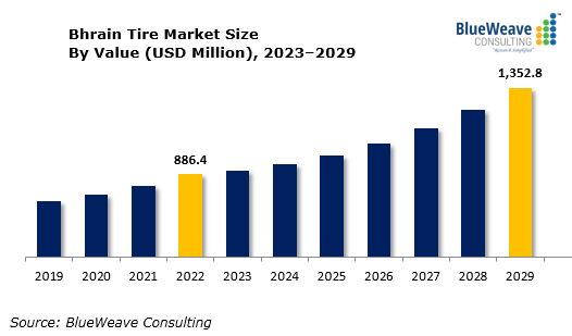 Bahrain tire market size was estimated at USD 886.4 million in 2022. During the forecast period between 2023 and 2029, Bahrain tire market size is expected to grow at a CAGR of 6.36% reaching a value of USD 1,352.8 million by 2029. One of the key elements driving up demand for tires globally is the rising sales of passenger, luxury, and electric vehicles (EVs) as a result of rapid urbanization and rising consumer spending power. The demand for premium quality tires with a longer operational life improved stability and reliability, and high puncture resistance is being fueled by the increased focus on driver and passenger safety as well as the rise in fatal traffic accidents.