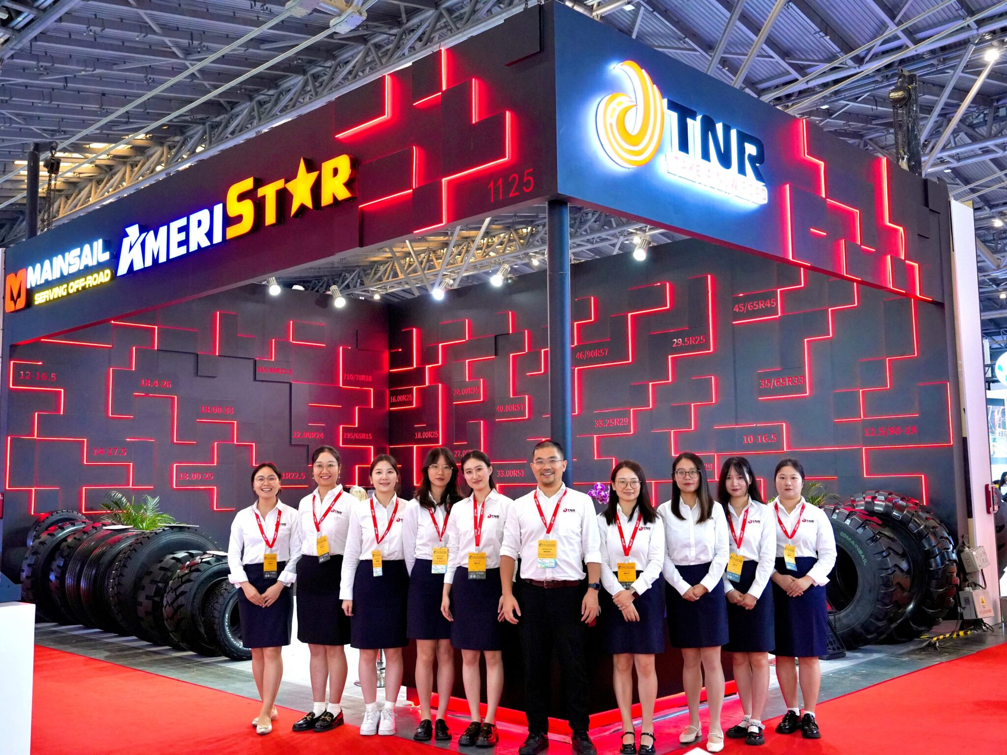The first thing visitors noticed was the clean, professional setup. Right at the front, a clear product board, showcased our extensive range of tire specs—from skid steer tire 12-16.5 to heavy-duty 46/90R57 sizes.