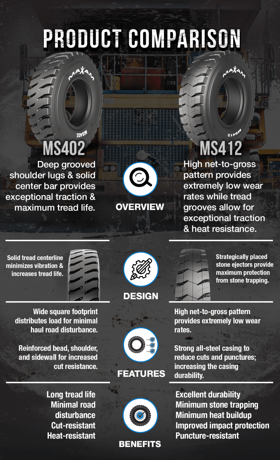 The MAXAM MS402 and MS412 are both E4 haulage truck tires that are suitable for similar use in higher speed or long-haul applications on well-maintained haul roads, but their tread pattern and design make a very distinguishable difference in terms of application needs and mine site’s specific demands.
