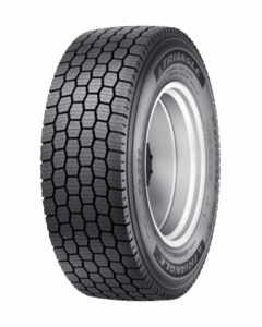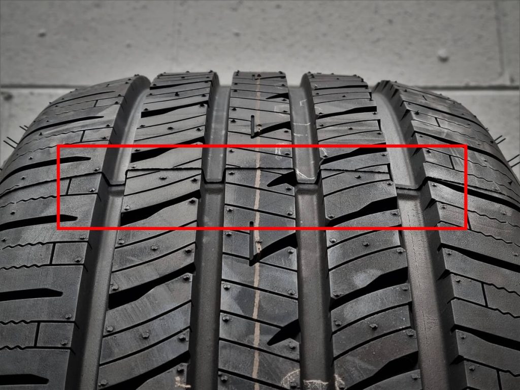 Different tread patterns featured on either side of the tread that enhance and optimize performance for both wet and dry handling. The inside shoulder has more grooves for water evacuation and massive tread blocks on the outside shoulder make for maximum handling.