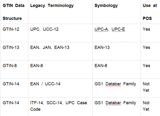 The table below further illustrates the relationship between GTIN, legacy terminology, symbologies and use at point of sale. In most cases, the legacy terminology and the symbology are called by the same name. GTIN changes this by separating the name of the data structure from the data carrier or, in this case, the symbology.