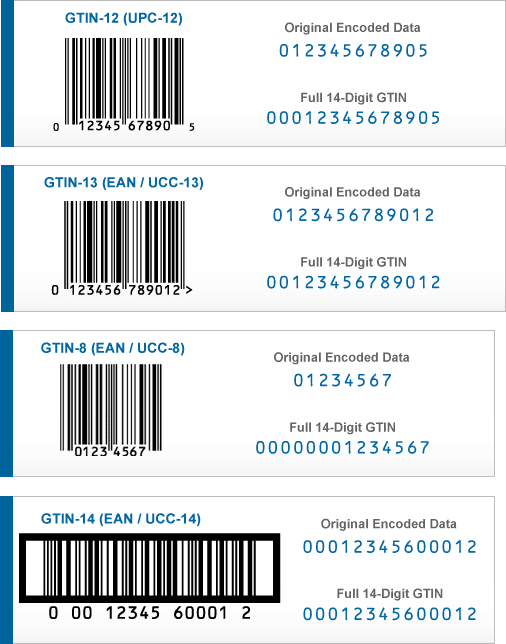 Today, five symbologies support this GTIN data structure: UPC; EAN; ITF-14; GS1-128; and GS1 Databar (formerly Reduced Space Symbology). Of these, ITF-14, GS1-128, and GS1 Databar employ 14-digit data structures of which the 14th character is a packaging level indicator (i.e., item or case). Both UPC and EAN have an implied packaging level of a single item. Therefore, these symbologies support the GTIN data structure without changing the number of encoded data characters.