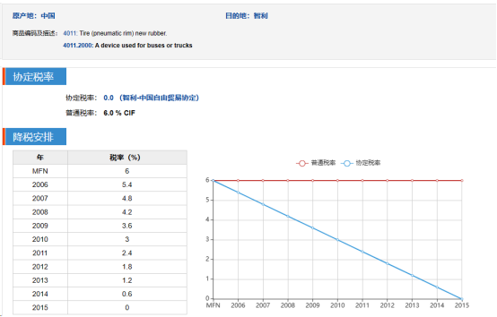 As shown in the figure above, in the case of China as the country of origin and Chile as the destination country, and the HS code is 40112000, the minimum tax rate is 0, then the tariff on this order is zero.
